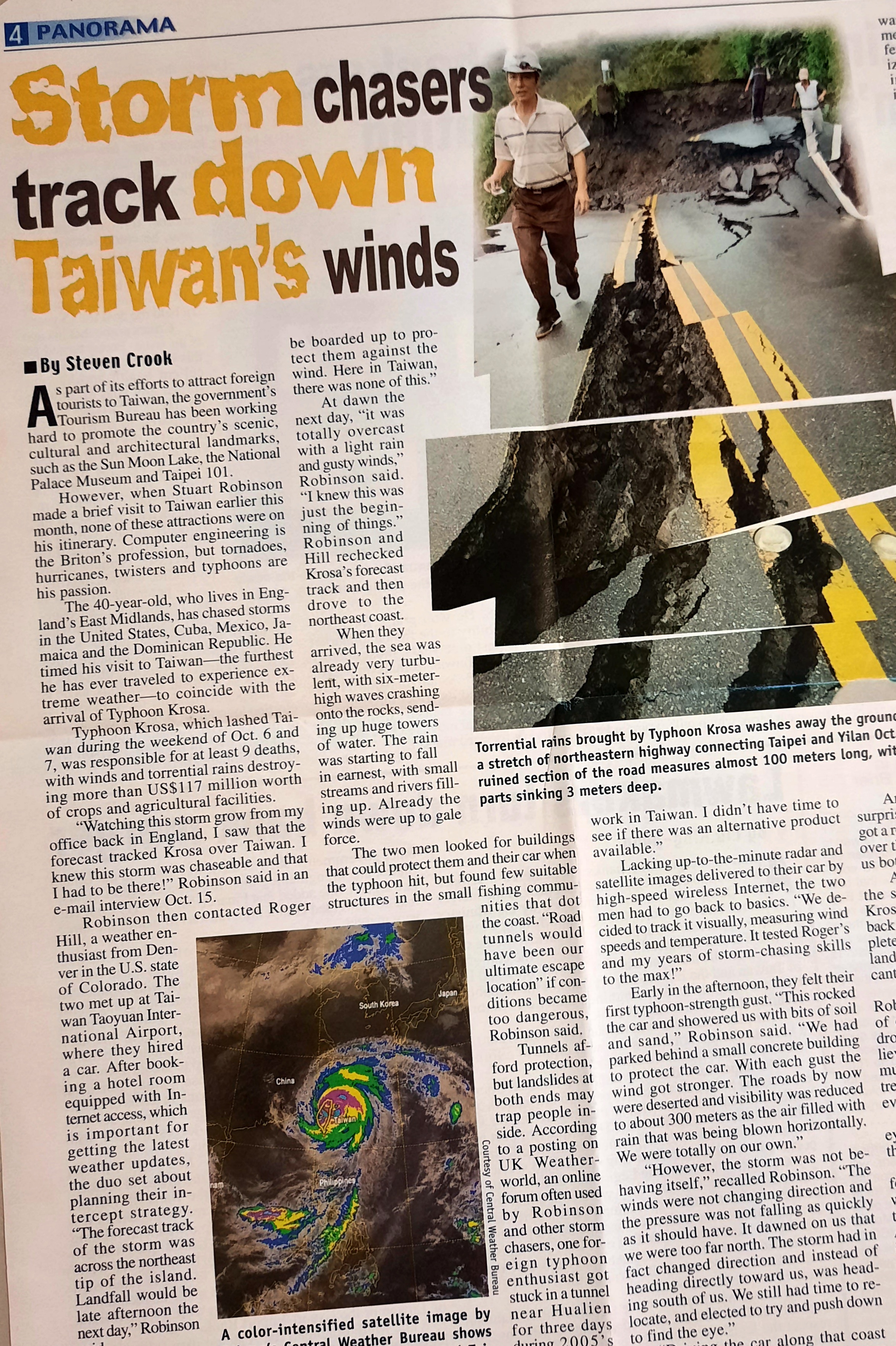 Robinson and Hill were not the only foreign storm chasers who rushed to Taiwan to catch Typhoon Krosa. According to Robinson, one came from Australia. Another, a Briton working in China, flew in from Shanghai.